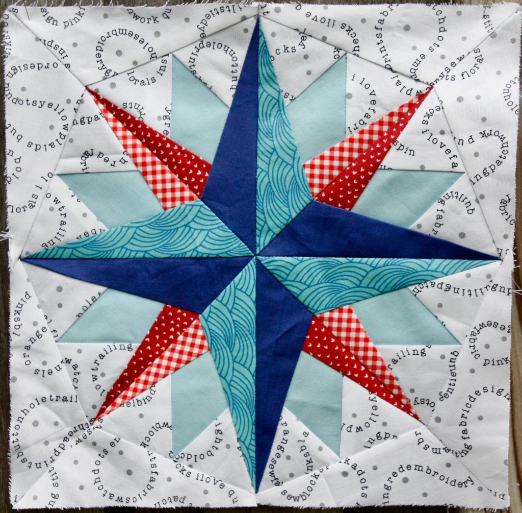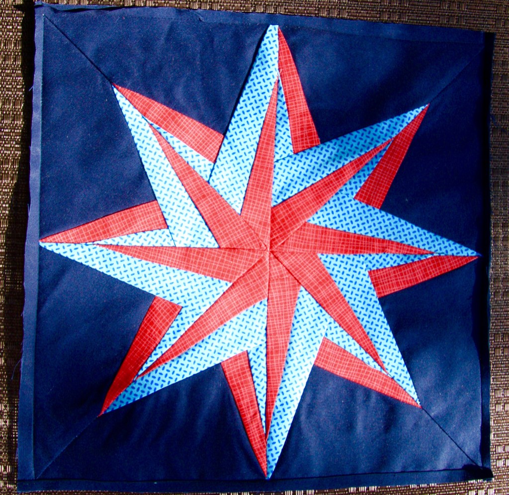 For now, I’ll just show you one fun paper-pieced block that I made and photographed this morning. It’s called “Which Way North” and is by Quilting on the Square. This block is not meant to be a star at all, but I think it works just fine with the theme. You can find the pattern at Wombatquilts.com. Cath of Wombatquilts has some of the best free paper pieced patterns anywhere.