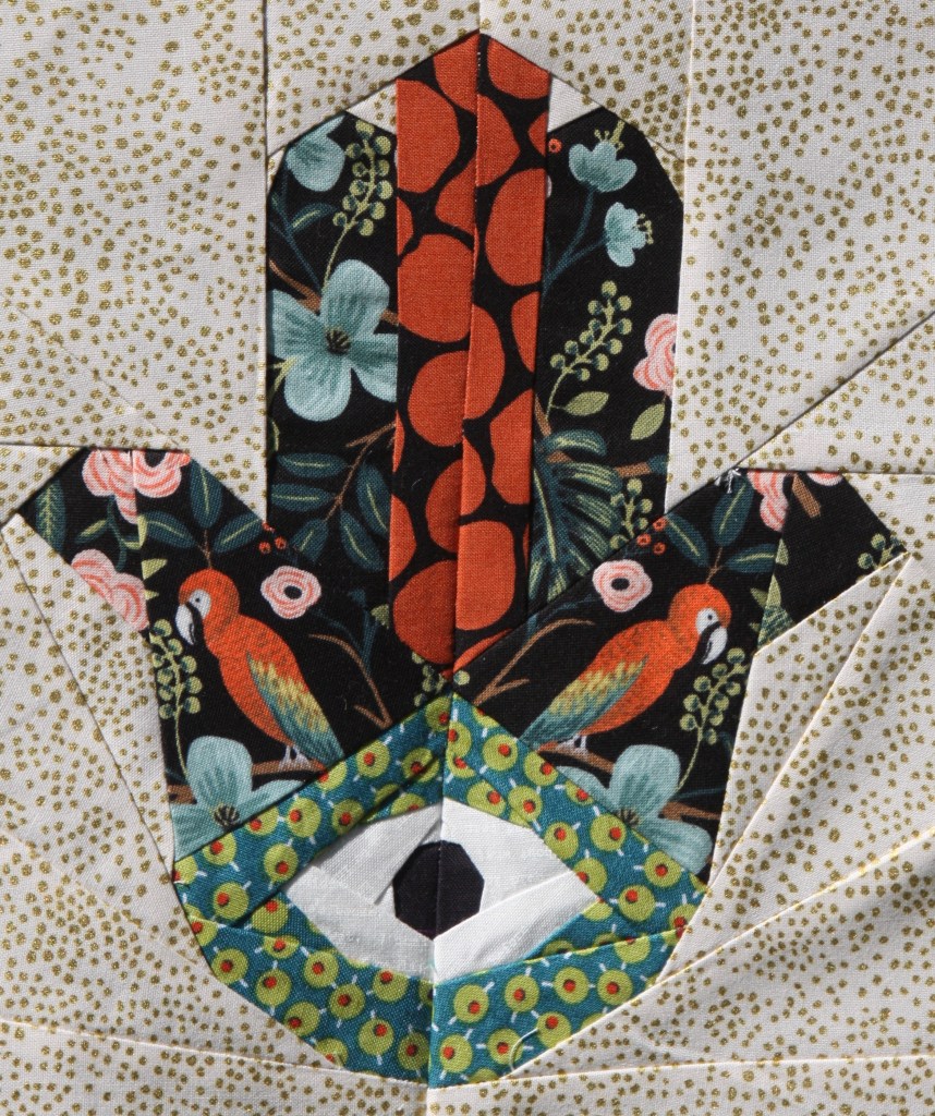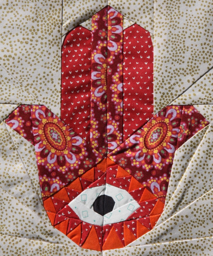 These fabulous paper-pieced hamsas are part of my newest quilt. I’m so very excited to share them with you. I bought the pattern from a wonderful Etsy site called Joe, June and Mae. They carry some great paper piecing designs and even donate to good causes like NAACP. The pattern cost me $8.16 and is easy to use and comes in two block sizes. I chose to use the 10″ x 10″ hamsa pattern so far, but I’m getting inspired now to try the 12″ x 12″ one too.