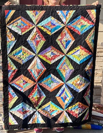 I like tossing in some novelty prints, but this was intended to be scrappy. I didn’t cut up fabrics unless I needed something of a certain size. All in all, in my humble opinion, this turned out gorgeous. I got the idea for the talented Amy Smart of Diary of a Quilter. I give her full credit, though I did create my own sized pattern to accommodate smaller scraps. My blocks are 5.5″ unfinished. I love this for using up strings or strips. I actually will go back to this one again and try it in just a few colors. Below is the completed top but alas, it still needs to be quilted.