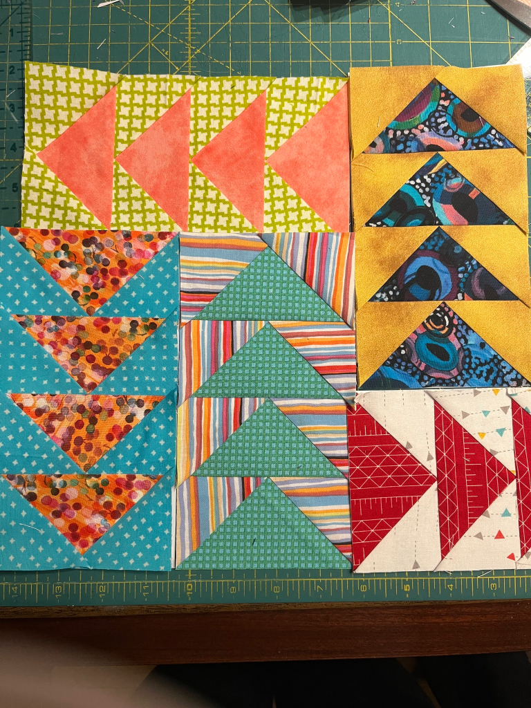 When my life seems hectic and stressful, I often turn to scraps to do some creative sewing. At those moments, I want something to take my mind off whatever is going on in my life, the world or both!! I had always wanted to make a flying geese quilt, so I tackled that doing paper piecing. I enjoyed the process and even posted about it on a quilting group on Facebook. I got the suggestion back to put in some two section geese, which I had not yet done. Naturally, it’s not completed yet. I always like making tops over finishing quilts!! Don’t judge. I’m a starter with more ideas than time!