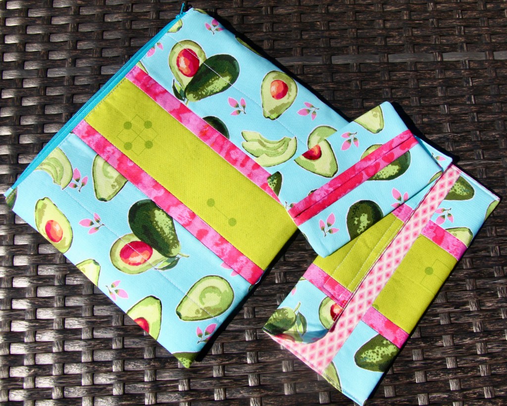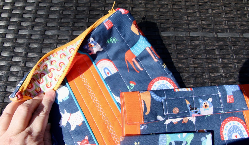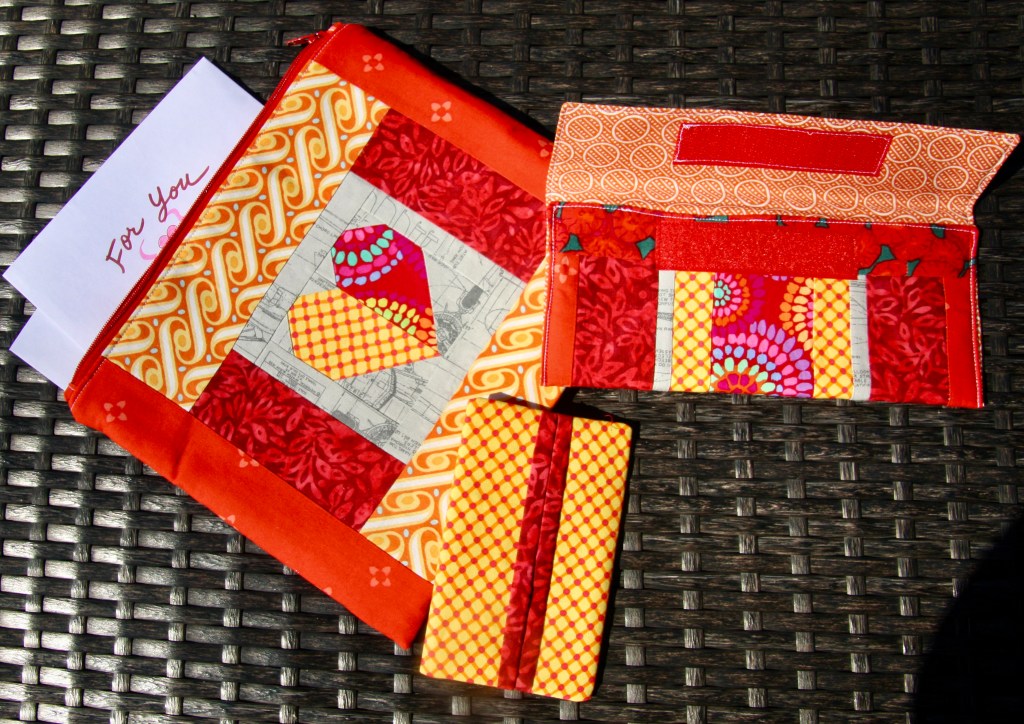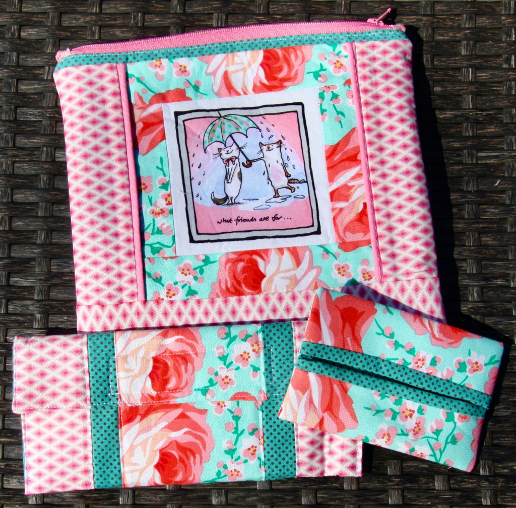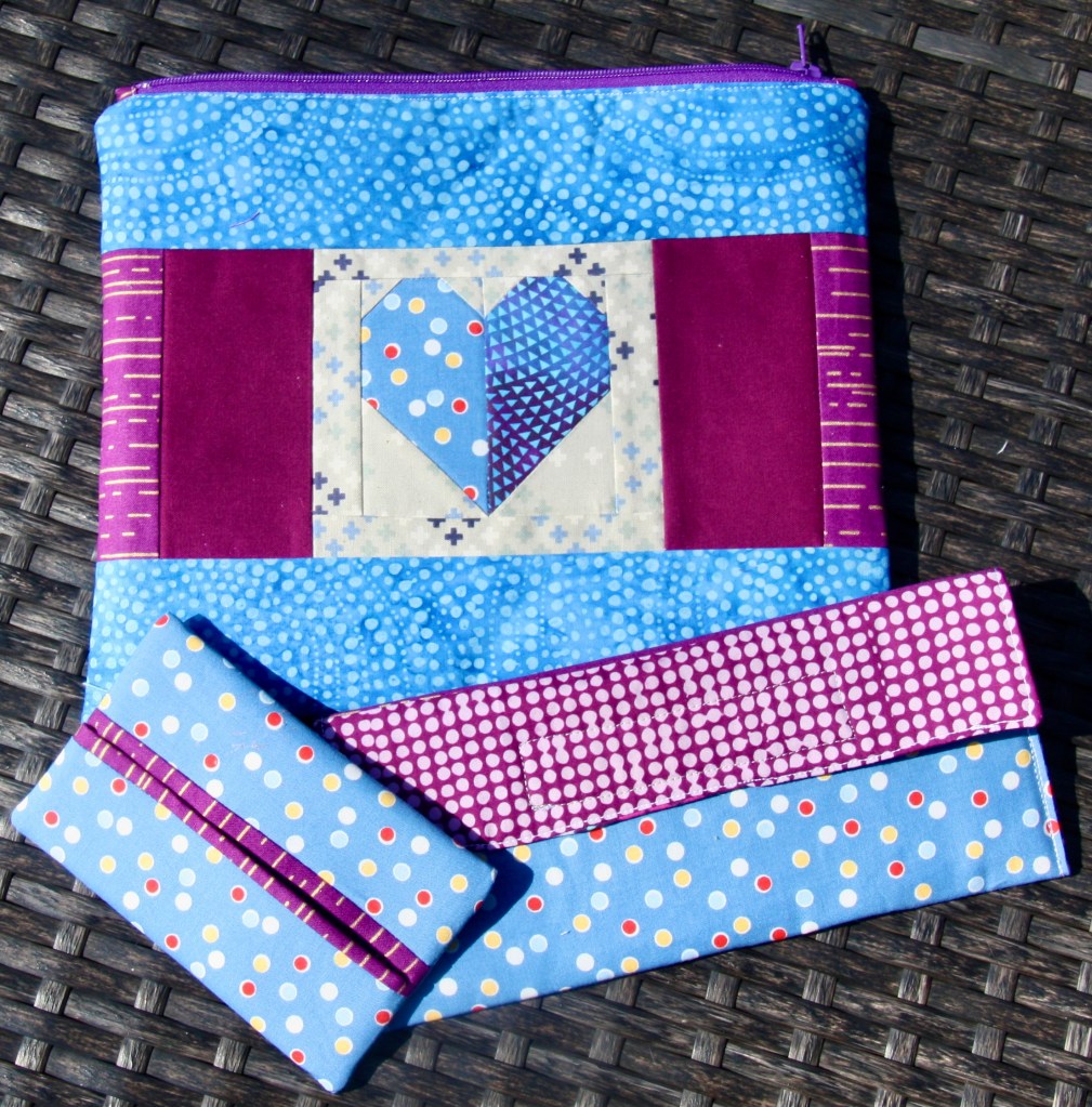 I did some basic foundation paper piecing with hearts on two of the bags. I fussy cut from a panel I had of lovey-dovey cats. I pieced from novelty fabric and used up some scraps. While Carole’s instructions call for velcro, I like to add zippers to my larger toiletry bags. I just think they look better and are more functional.