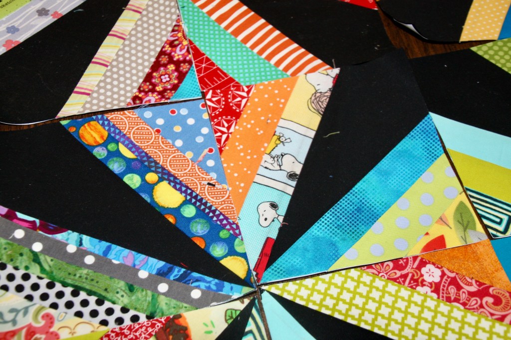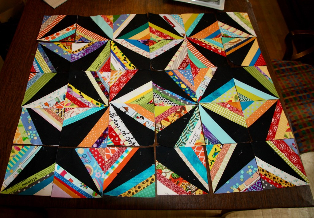 The paper is still behind each one. I keep that on until it’s sewn into a flimsy. I made my own pattern for this one. My blocks are 6″ unfinished. I wasn’t able to find a pattern that I liked for this design. There are many online to choose from, but I just felt they were all too big. In the end, I made this little quilt much larger than planned. I’m waiting to sew it until I know where it’s going to end up.