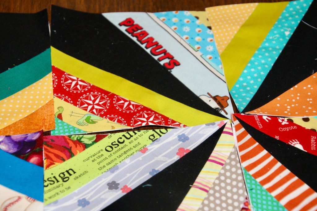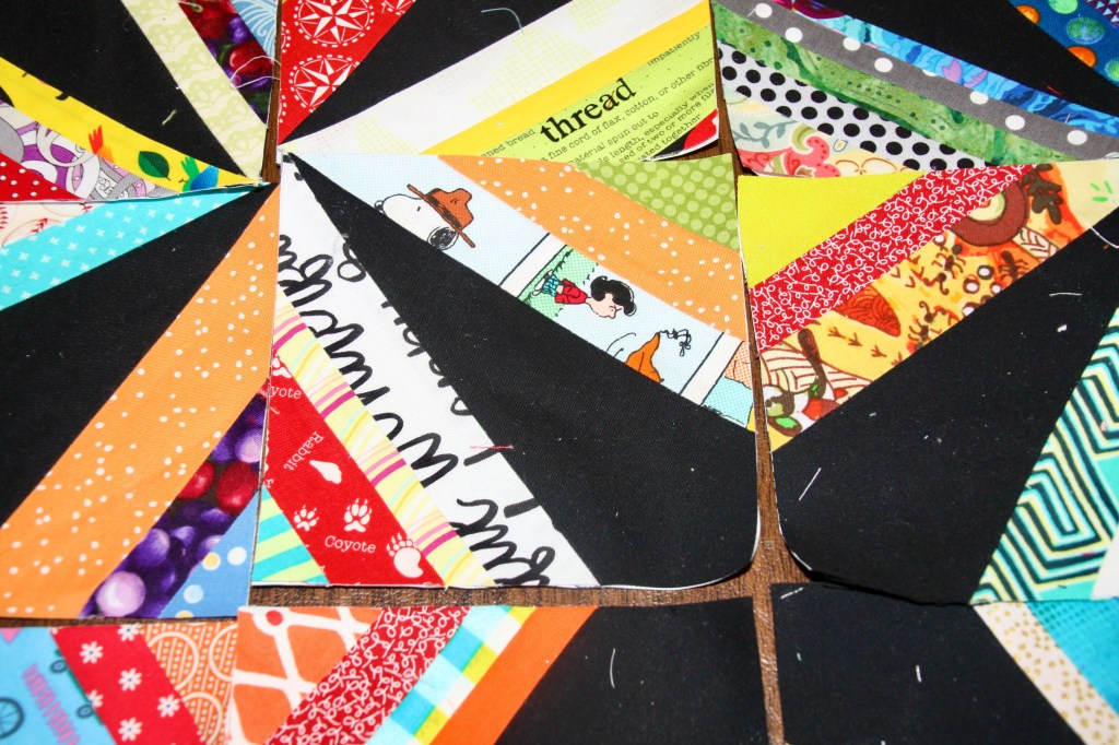 Finally, I’m working on some smaller blocks that aren’t pulled together yet. Here’s a scrappy string star quilt in progress. Notice all the bits and pieces of a Peanut’s fabric line from Joann’s. While I don’t usually love the quality of trademark fabrics, this one in bits is perfect for the little touch here and there.