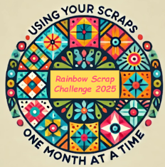 Rainbow Scrap Challenge 2025: Just dig into your scraps and find something to match the color of the month. In December we will post our quilting and finishing of projects. The June color is Orange.