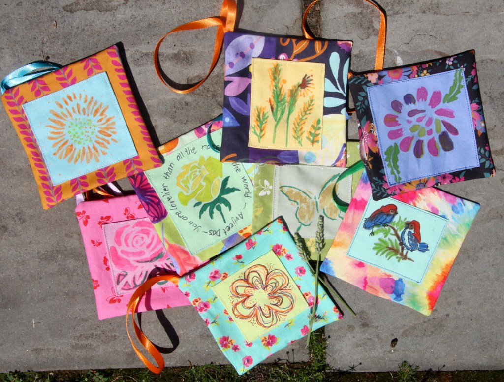 Finally, if you’ve made it this far. Here are some of the lavender sachets in progress. We still need to stuff them. They are being made by residents at the Assisted Living facility where I work as an art therapist. The front designs were made using fabric markers. In a few weeks, these bags will be stuffed with rice, lavender oil and lavender buds. They will be sold at a fundraiser for Alzheimer’s Association.